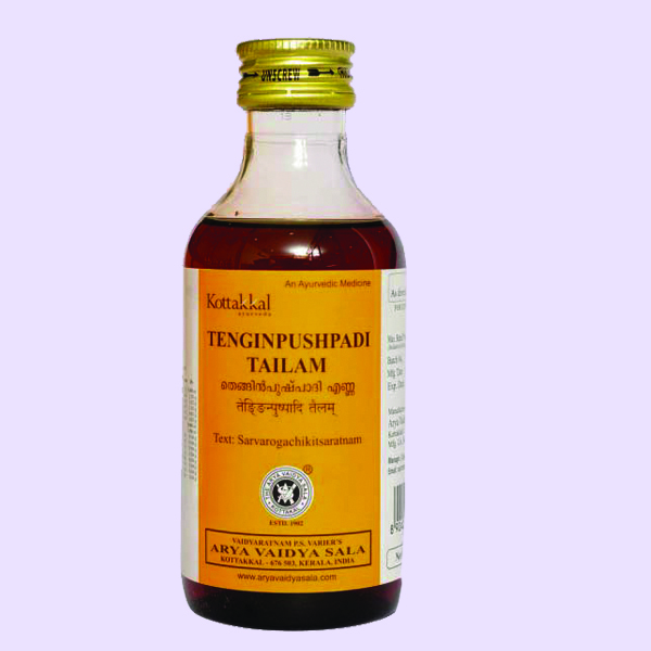 Ingrédients de Tenginpushpadi Tailam: Narikela (Cocos nucifera) Guduchi (Tinospora cordifolia) Tila taila (huile de gingembre) Payas (lait de vache) Narikela jala (eau de coco tendre) Gramme vert (Phaseolus mungo) Arille Jatamamsi (Nardostachys jatamansi) Chandana (album Santalum) Mode d'emploi de Tenginpushpadi Tailam: